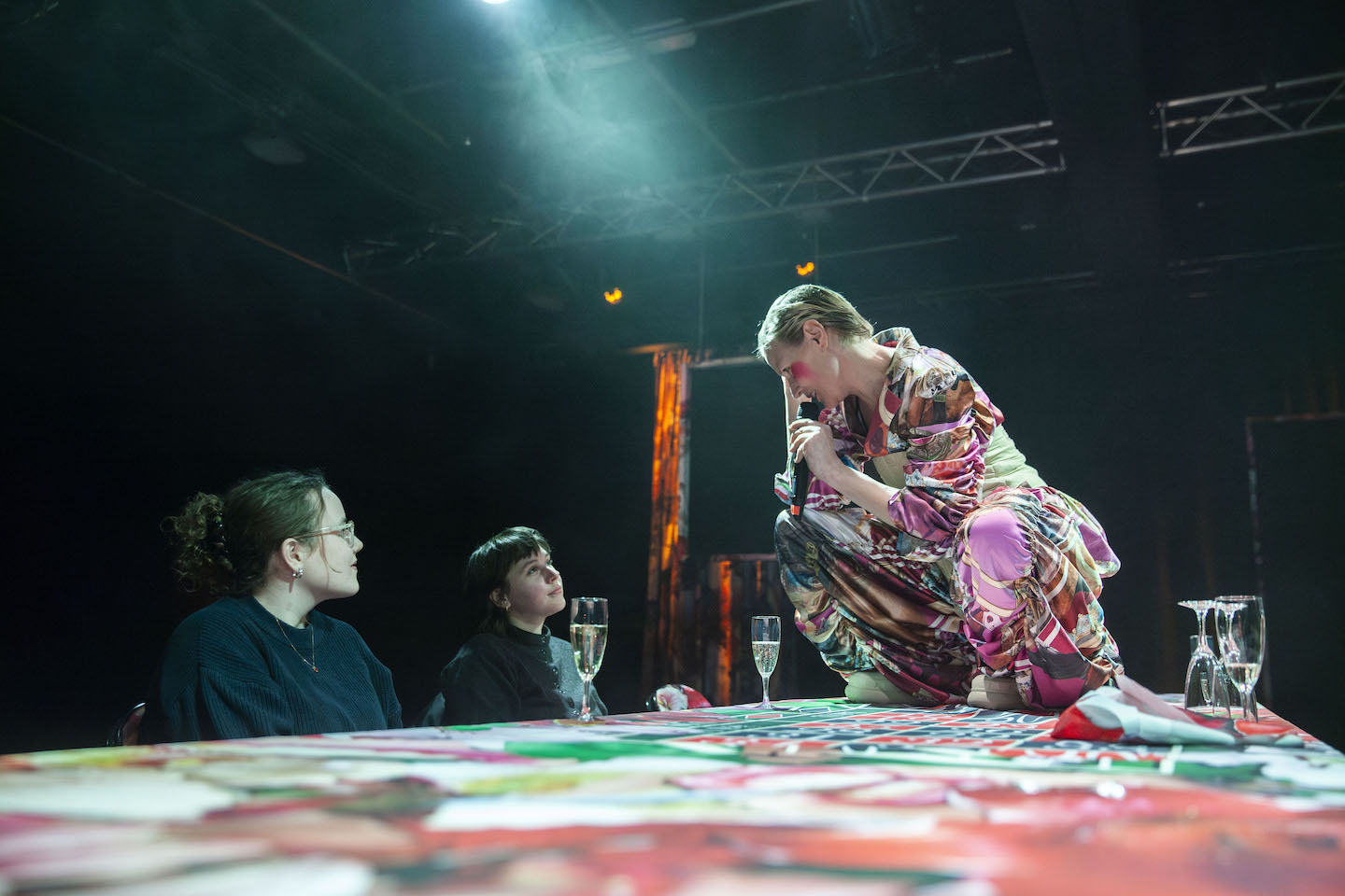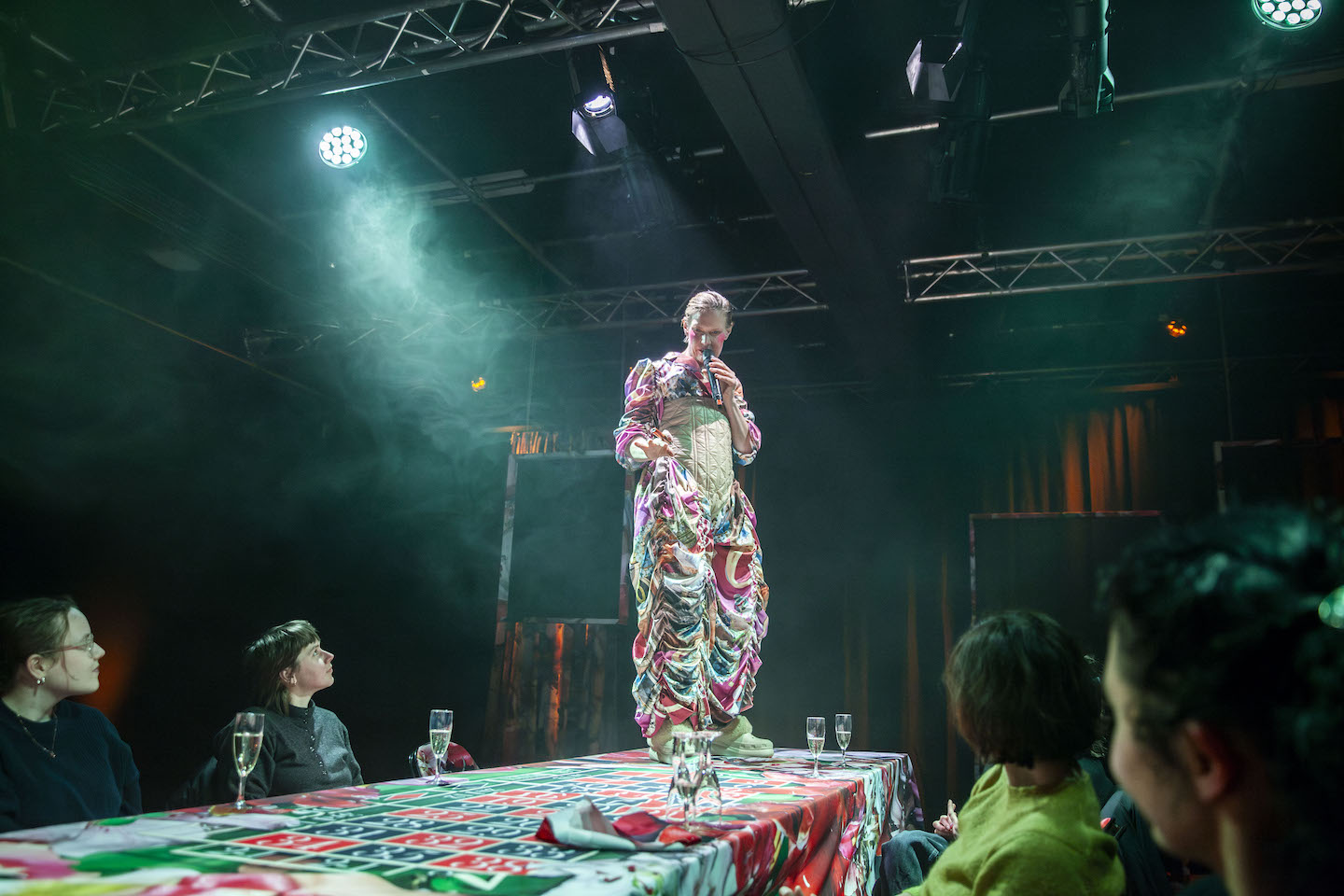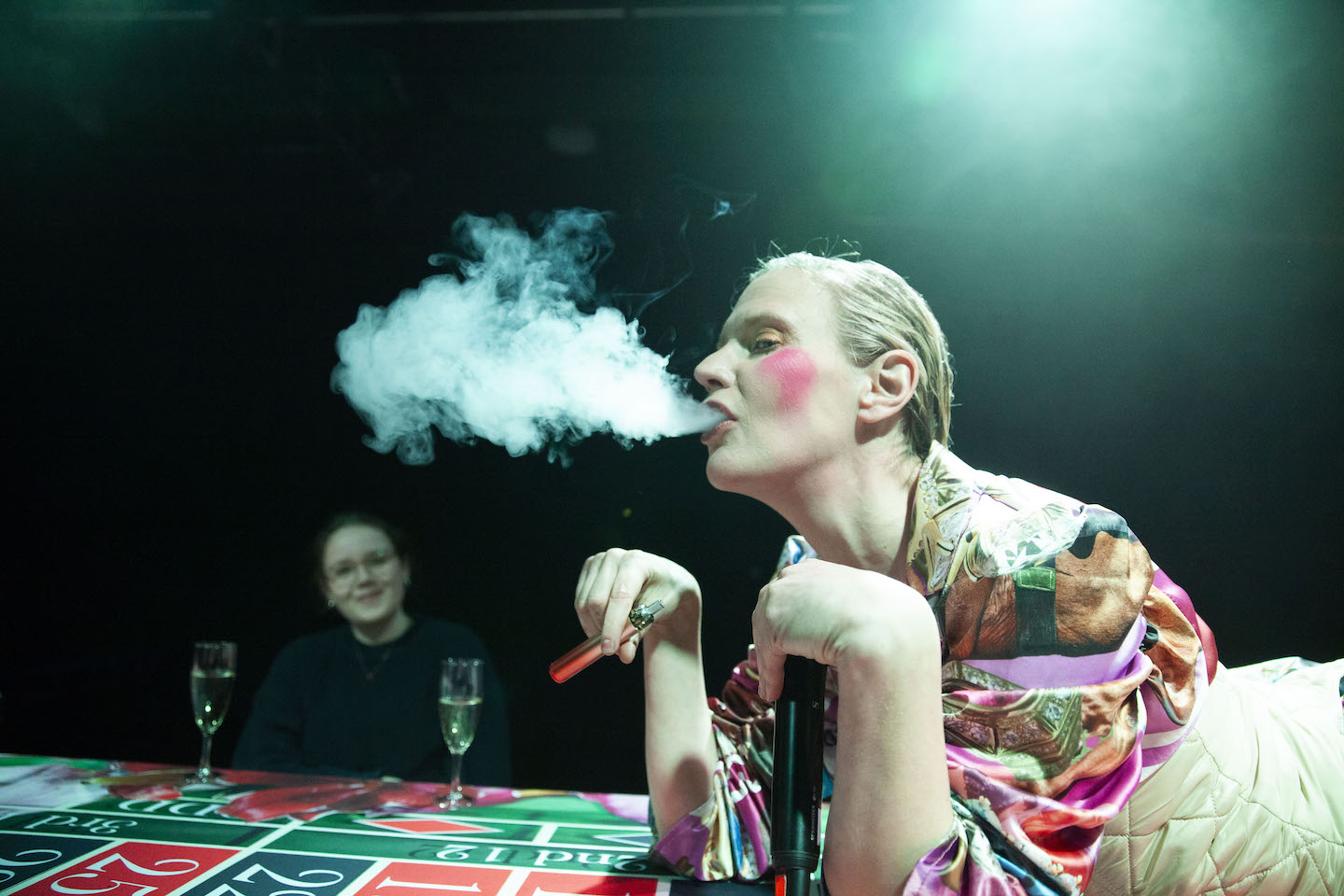 Frauen und Fiktion zeichnen sich durch ihre genaue Recherchearbeit aus, die die Grundlage für ihre Performances bildet. Während sich das Kollektiv bisher zumeist auf interviewbasierte Texte bezogen hat, konzentriert es sich in dieser Arbeit mit dem Regisseur und Autor Sahba Sahebi auf die Collage unterschiedlicher Textformen – den Rückgriff auf Fragmente aus Dostojewskis Roman „Der Spieler“ sowie die eigene Textentwicklung während der Probenarbeit mit Charlotte Pfeifer. Im gemeinsam entwickelten Monolog werden Gedankenfäden aus Dostojewskis Roman – zu den Themen Erben, Spielen und Arbeiten – ins Heute weitergesponnen und dabei einige verbreitete Grundannahmen infrage gestellt. Wie schon bei vergangenen Theaterarbeiten und auch beim Hörstück “Cash Club – Wir reden über Geld” steuert Jonas Mahari die musikalischen Atmosphären zur performativen Testamentsverlesung bei.