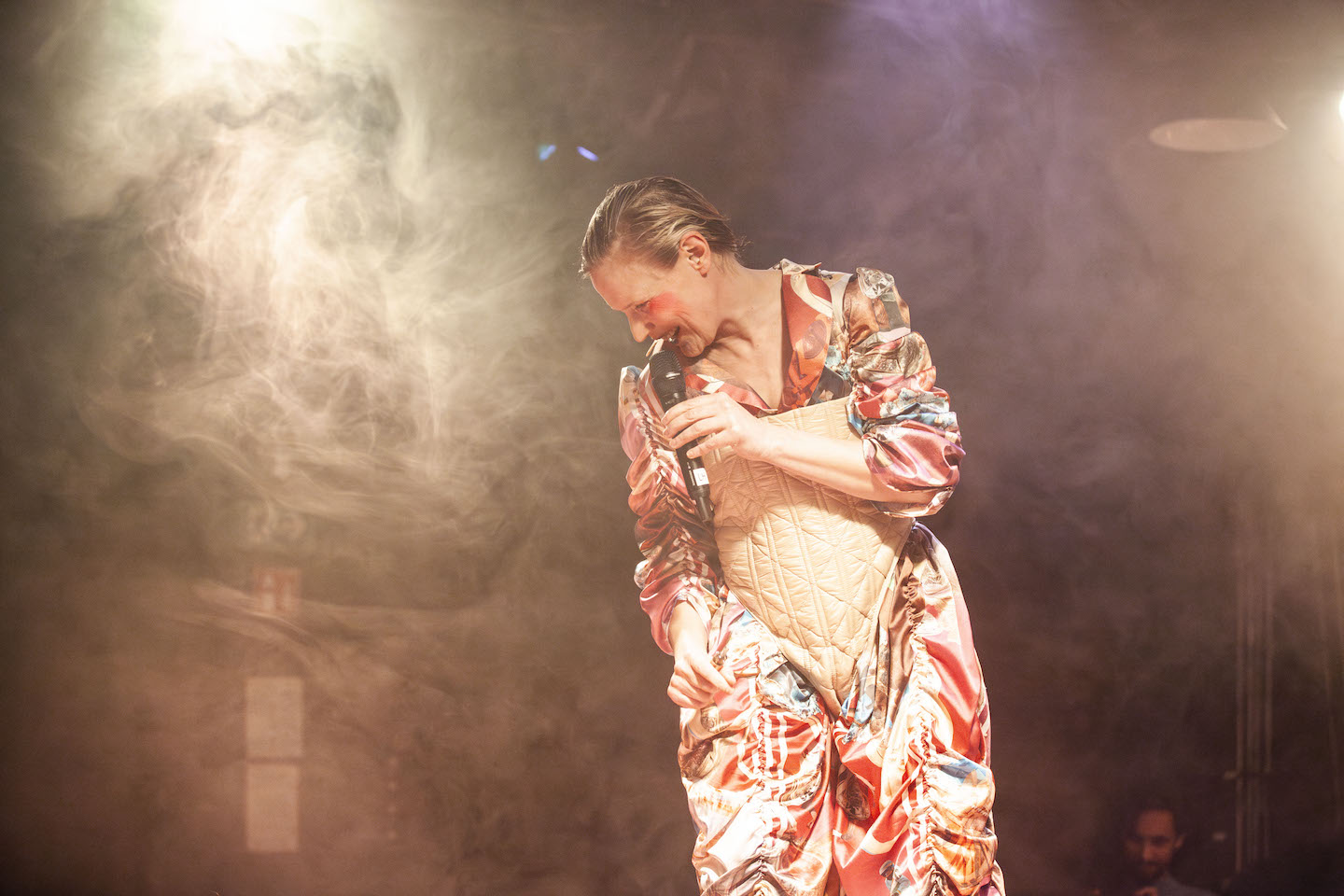 annehmen. Pfeifer singt ein Lied, räkelt sich auf der Bühne, wechselt das Kostüm (Felina Levits), das ist