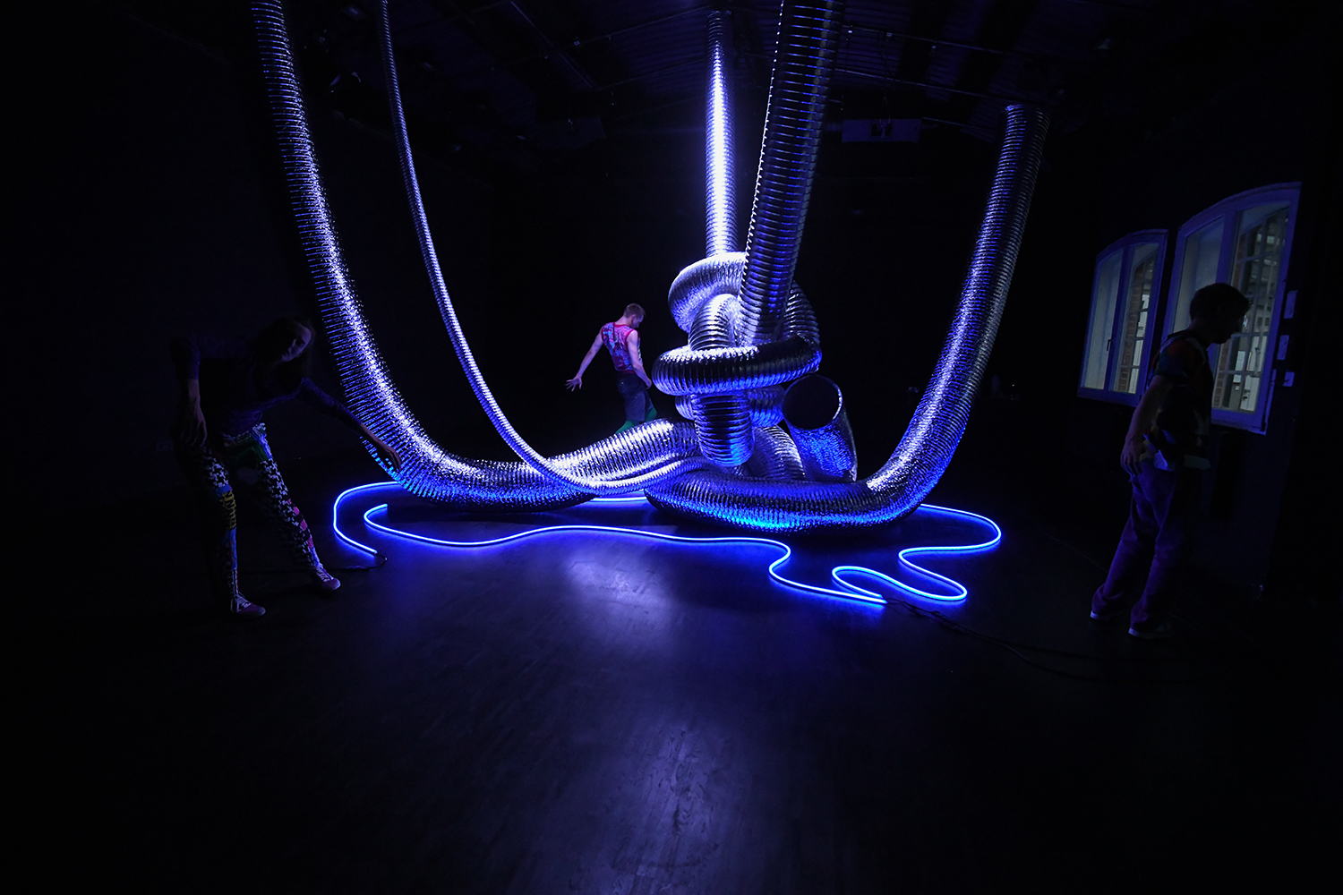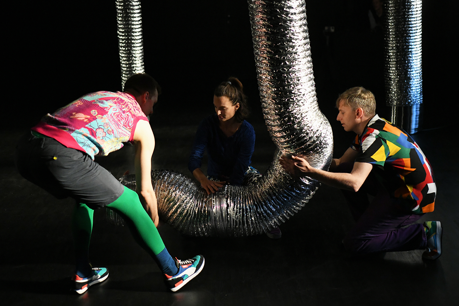 In Follow the dopamine untersucht das Performancekollektiv Merle | Mischke | Klee ADHS-typische Eigenschaften, wie Begeisterungsfähigkeit, Kreativität oder Empathie, und reflektiert darüber, wie unterschiedlich sich Konzentration, Impulsivität und emotionale Verletzlichkeit anfühlen. Kein Gehirn ist gleich, obwohl das äußerlich nicht erkenntlich ist. Wie lernt man also, nicht von sich auf andere zu schließen? Die drei Performer:innen suchen ein ständiges Miteinander und werden zu einer gemeinsam hüpfenden, tanzenden und ineinander verschlungenen Gruppe, die sich immer wieder selbst befragt: Was heißt es, mit den Bedürfnissen und Fähigkeiten Anderer achtsam umzugehen? Dabei bespielen die Künstler:innen ein interaktives Bühnenbild aus silbernen Röhren und leuchtenden Schläuchen, die an neuronale Verbindungen erinnern und deren Geräusche zum Soundtrack werden. Das Trio gibt sich konzentrationshohen Phasen des Hyperfokus hin und verfällt immer wieder dem Chaos, der Ablenkung und der Erschöpfung.