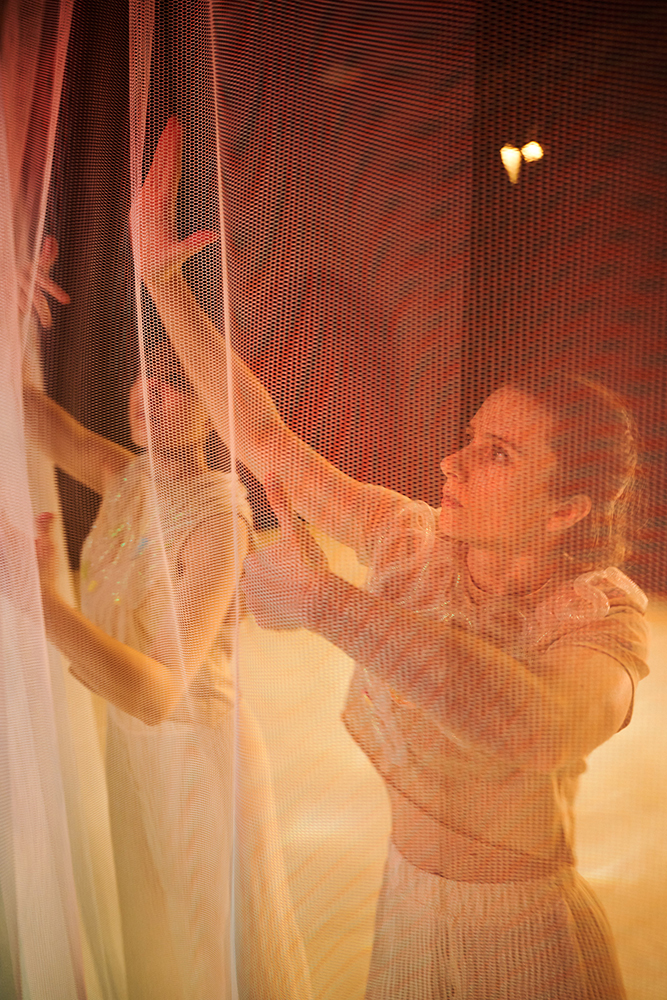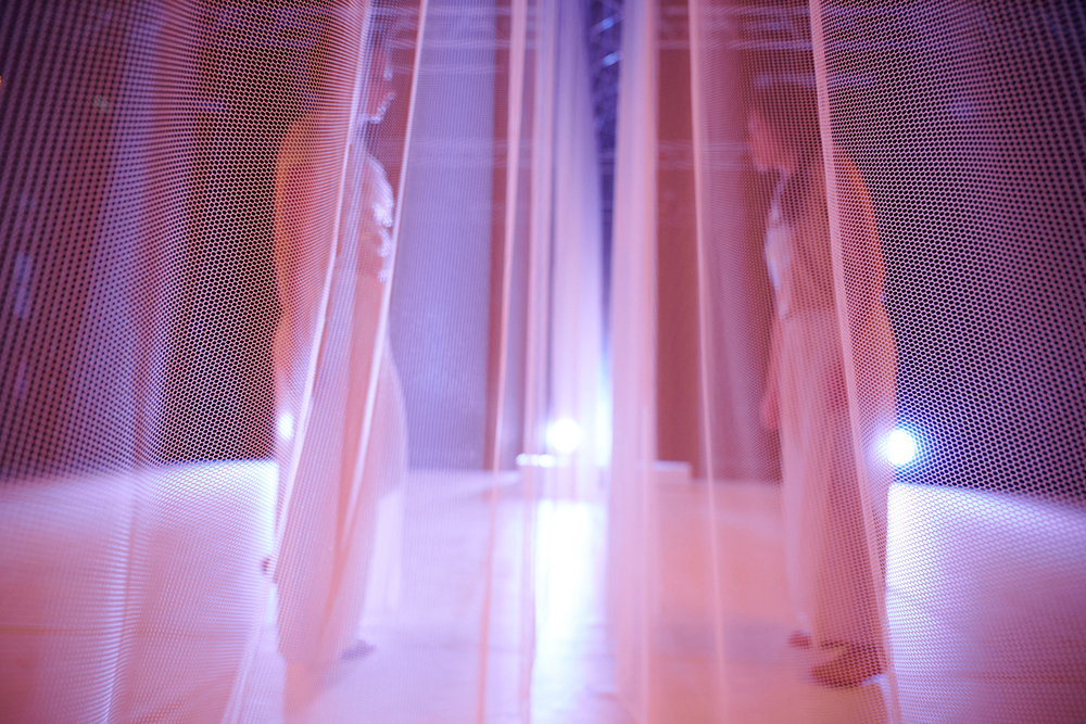 Through the 3-meter-high and 8-meter-wide moving screen on which a film is projected, the two dancers communicate with each other as well as with the audience through the choreography, which consists of static and dynamic phases and shows forms inspired by hand and body mudras.