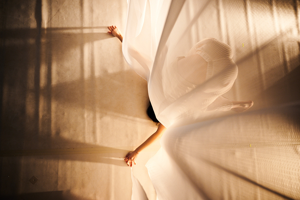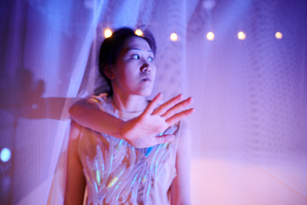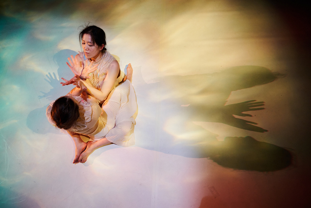 Durch eine drei Meter hohe und acht Meter breite bewegliche Leinwand, auf die ein Film projiziert wird, kommunizieren die beiden Tänzerinnen Ying-Yun Chen und Isabella Boldt sowohl miteinander als auch mit dem Publikum über die Choreografie, die aus statischen und dynamischen Phasen besteht und Formen zeigt, die von Hand- und Körpermudras inspiriert sind.