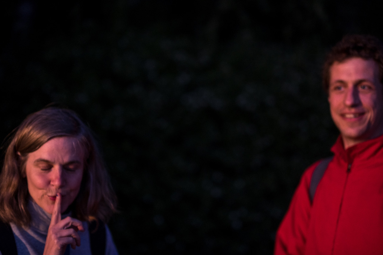 Esther Pilkington ist Performancemacherin und -forscherin. Manuel Scuzzo ist Klangforscher und Musiker. Beide leben und arbeiten in Hamburg. Seit 2022 arbeiten Pilkington und Scuzzo in verschiedenen Konstellationen immer wieder zusammen. nachtwandeln entstand im Juni 2023 im Rahmen des blurred edges Festivals und wurde dort erstmals öffentlich präsentiert (Hier gehts zur Dokumentation). In diesem Projekt haben sie ihr gemeinsames Interesse an der Nacht mit dem Spazierengehen verbinden können, das beide bereits seit Jahren (bisher getrennt voneinander) als künstlerische Praxis verfolgen.
