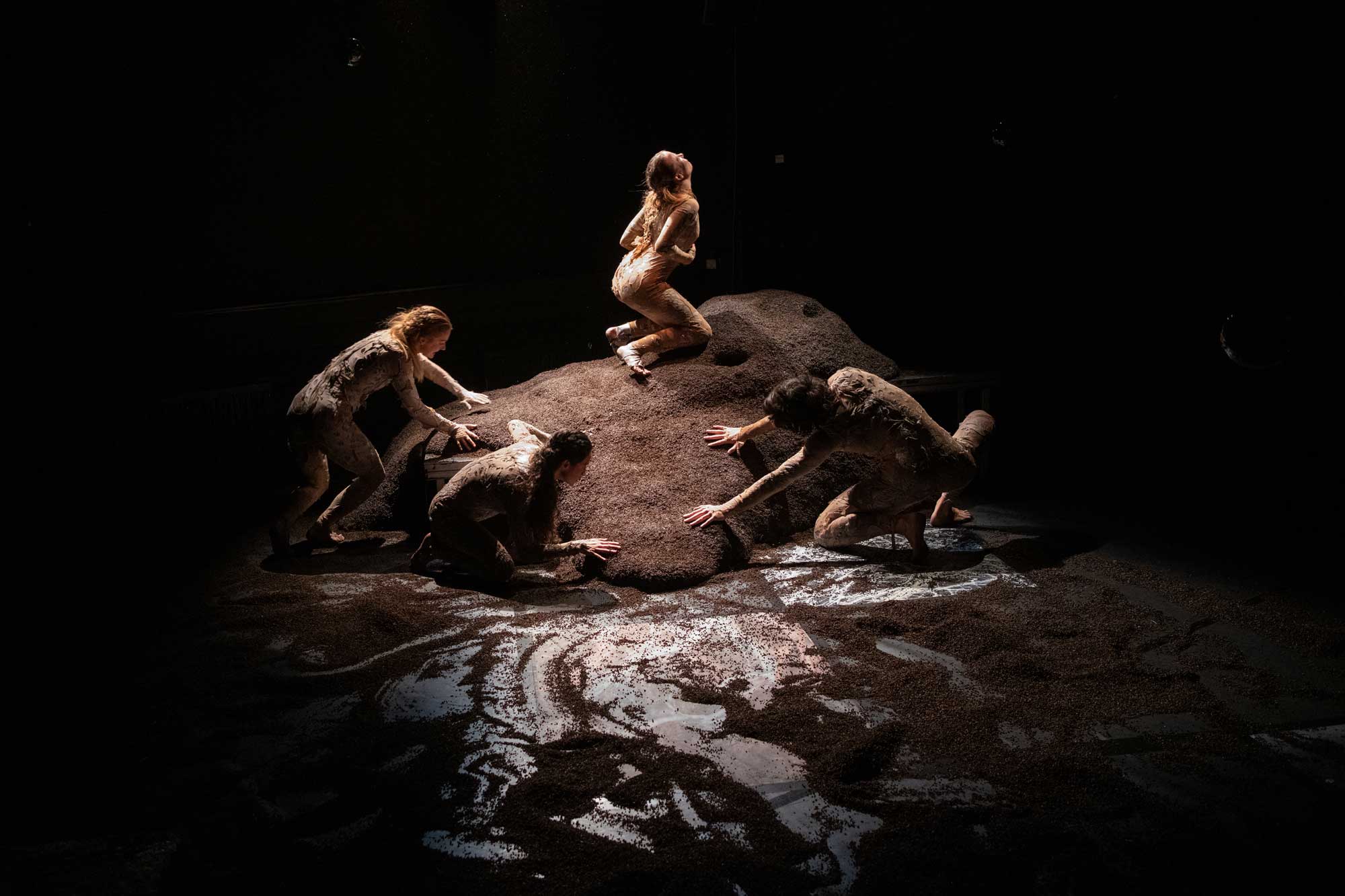 Die mexikanische Choreografin Yolanda Morales verwandelt gemeinsam mit ihrem Team die Bühne in einen durch Licht, Sound und Muster atmosphärisch aufgeladenen mythologischen Raum. Das Zeitalter des Anthropozän ist Vergangenheit, die prophezeite ökologische Krise ist eingetreten. Einige Menschen haben die Katastrophe überlebt. Sie erinnern sich noch an alte Zeichen und Narrative, sind aber in einer Phase des Übergangs und der Verwandlung. In Anlehnung an Donna Haraway s Figur der Camille aus ihrer feministischen Utopie „Unruhig bleiben“ schlüpfen die Tänzerinnen auf der Bühne in Körper, deren menschliche DNA verwandt sein könnte mit einem Insekt oder auch einem Pilzgeflecht. Sie haben miteinander eine neue Fähigkeit entwickelt: Sie können ein nervöses, hochsensibles, emphatisches System herstellen, in dem jede Empfindung, jede Schwingung mit allen anderen im Raum geteilt wird.