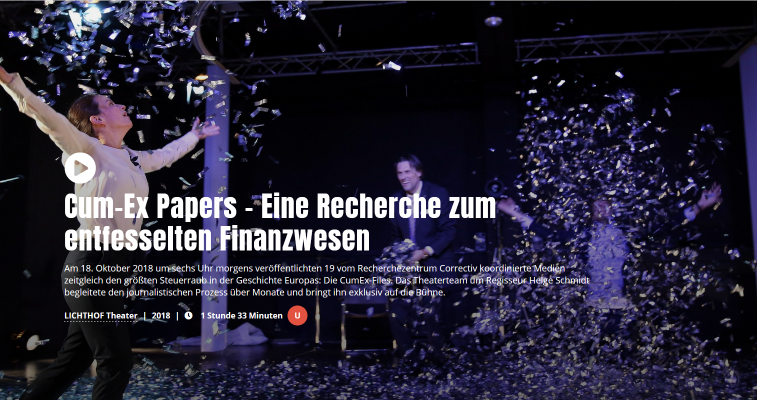 Hier geht es zur Aufzeichnung der Produktion Cum-Ex Papers auf Spectyou, die mit dem deutschen Theaterpreis FAUST ausgezeichnet wurde: