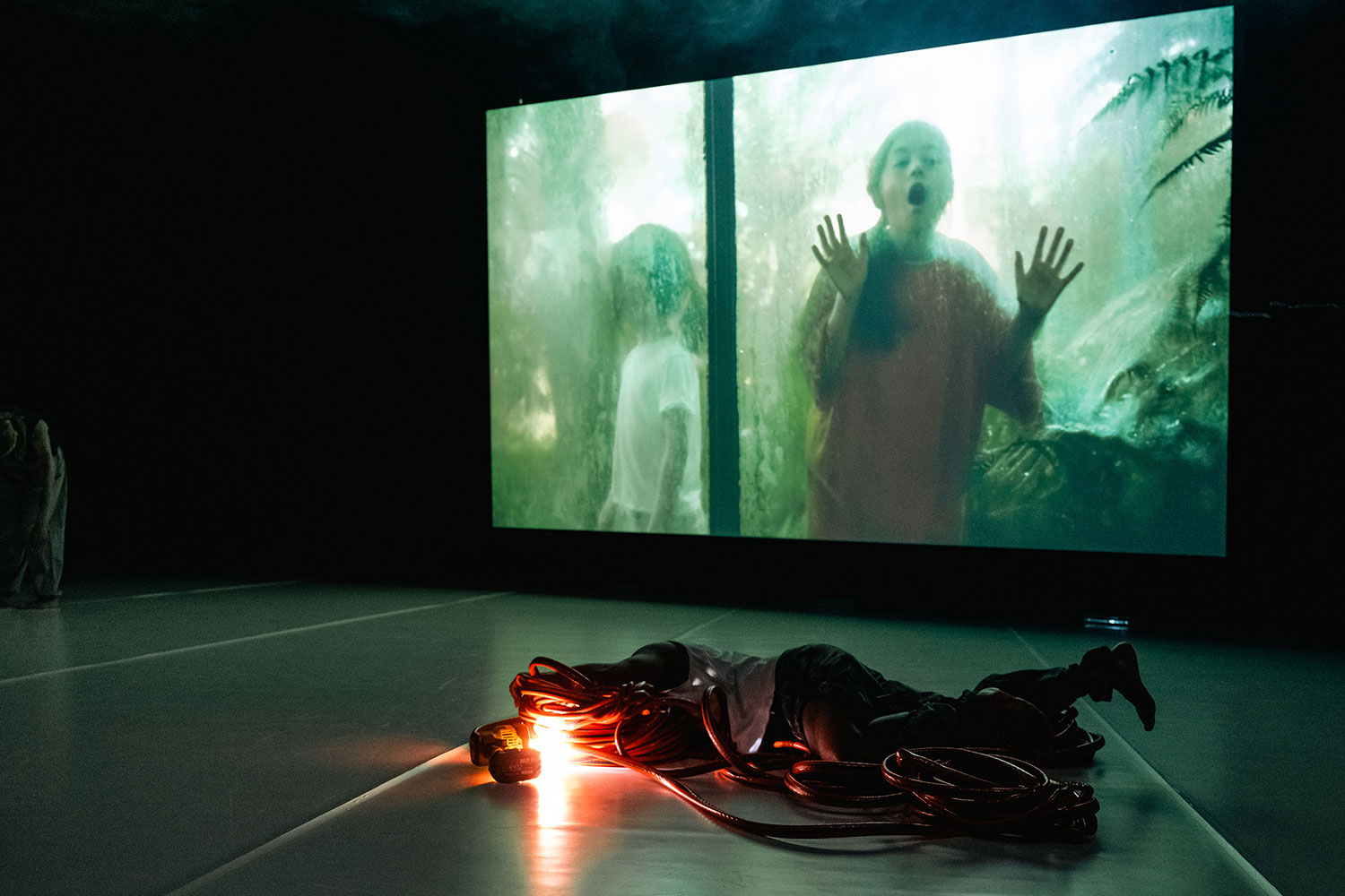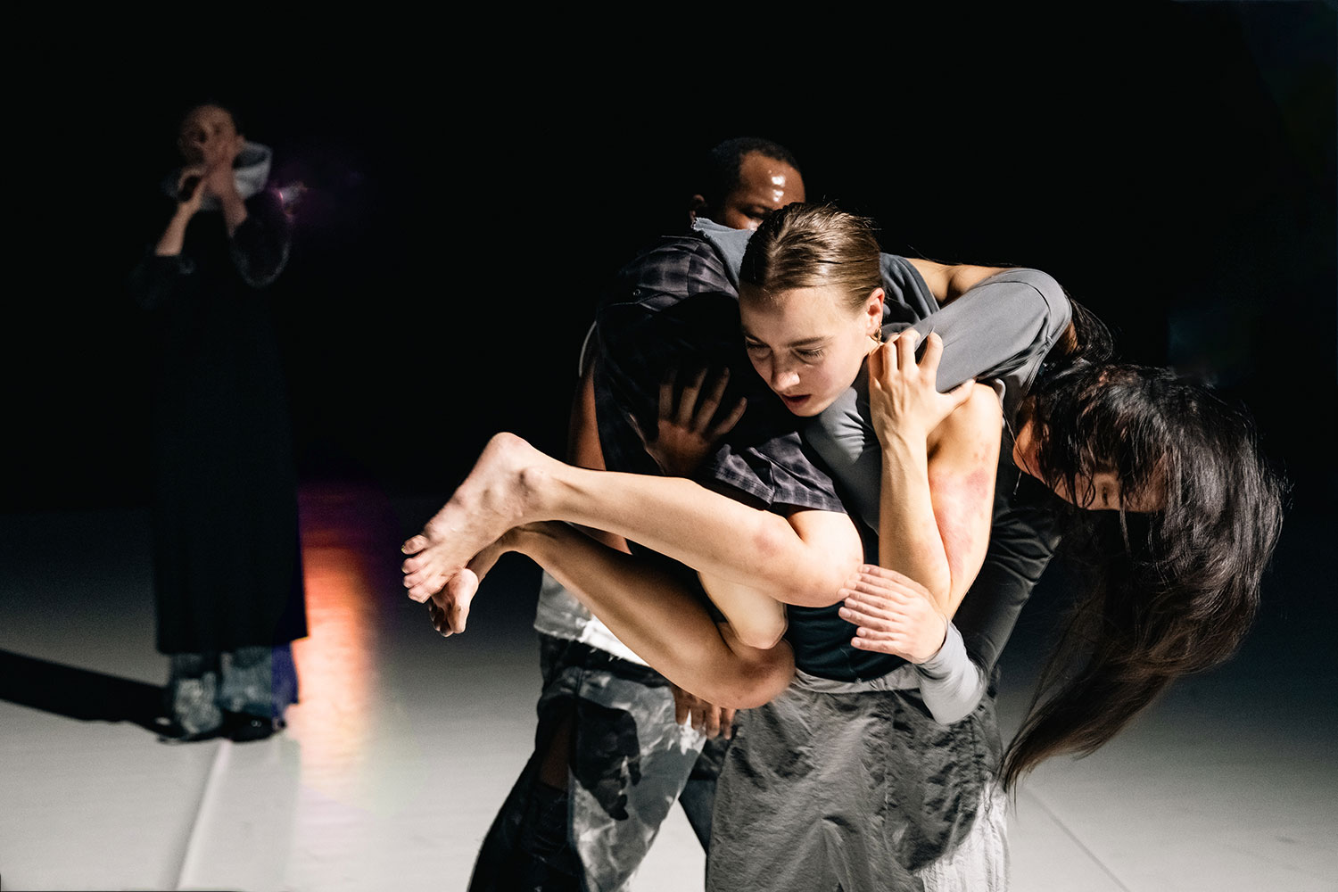 Three dancers and one singer move through changing climatic conditions. Amidst an acoustic weatherscape, they look for ways of coping with anger, anxiety, panic, and helplessness. They negotiate the distribution of resources and responsibilities. They try to keep everyday life running, torn between hope, pragmatism, and self-accusation. This is how we survive becomes their recurring mantra. The children are absent. Time and again, we catch a glimpse of their habitation, as if through a window – a climate capsule? Where are they, and what do they do there? Is there anybody caring for them? Do they wonder: Why did you not fight harder for us?