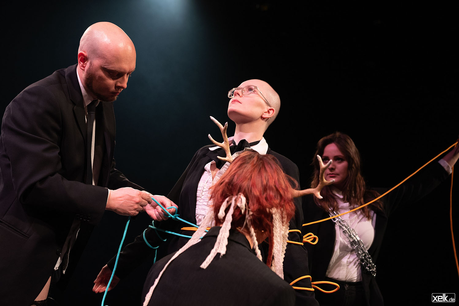 The queer-kinky artist ensemble XelK presents an immersive music and party theater. There is dancing, singing and partying while the spirit of Franz Kafka is summoned. A „monstrous vermin“? Gregor Samsa’s story initially sounds like a surreal orgy of self-destruction. But what if we look at it from a different perspective? In the party happening „Tranceformation (Kinky Kafka)“ XelK gets to the bottom of this: Can we read Kafka as empowerment? As the audience gets involved in the round of music, dance and kink as they please, the theater becomes more and more of a party. Transformation as a dance-like absorption in Kafkaesque ecstasy! After 90 minutes the performance seamlessly transitions into a party with DJ Lady Oelectric. Kafkaesque-appropriate clothing is requested.