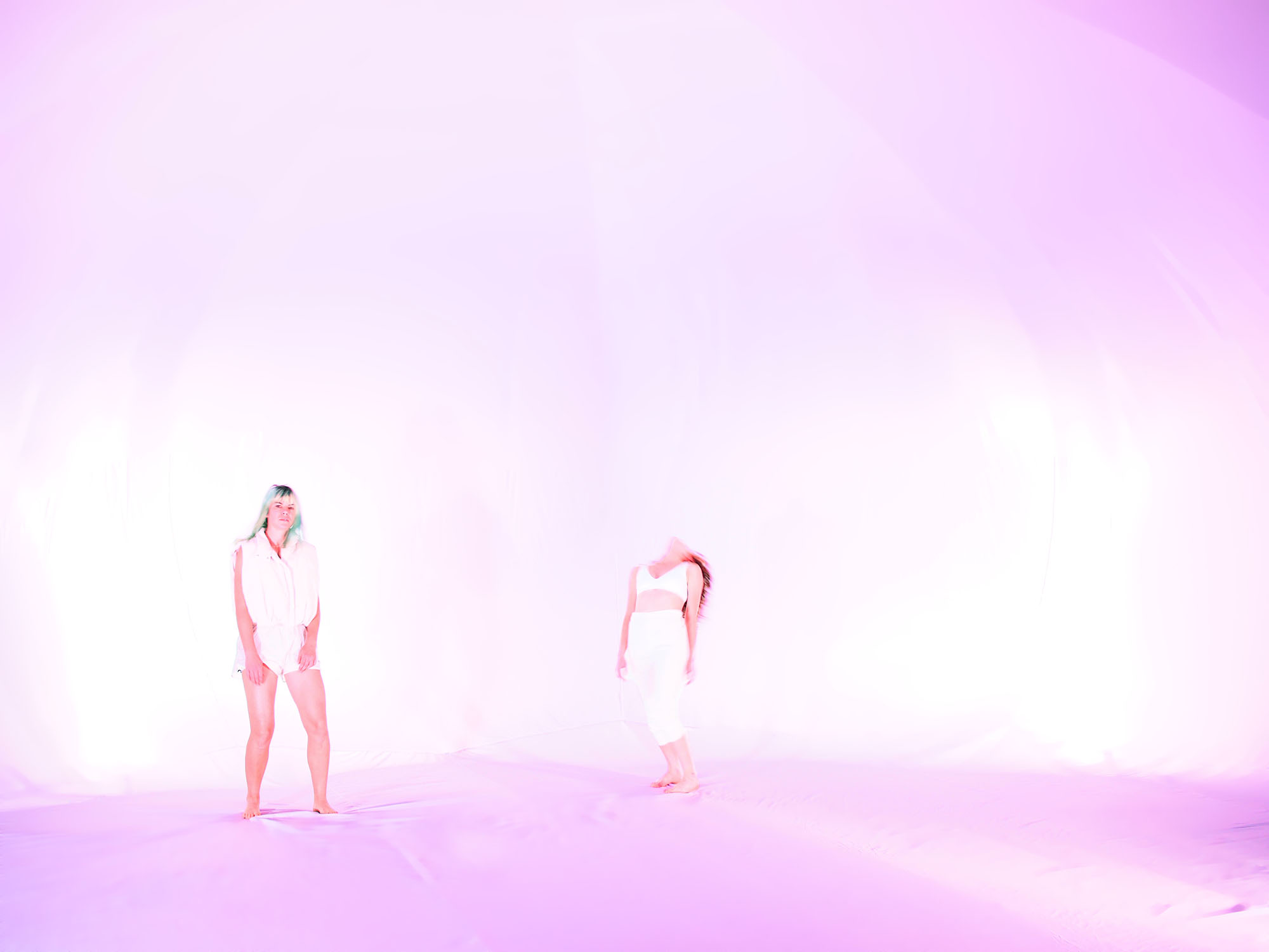The set for this multimedia installation is a huge walk-in air bubble made of white balloon silk, illuminated by LED lamps. The air bubble as a performative space, creates a vacuum, a void, in which the material constantly recomposes itself. The space appears in an ever-changing, „new light“, playing with the de- & illusion of the audience’s perception as a fluctuating narrative.